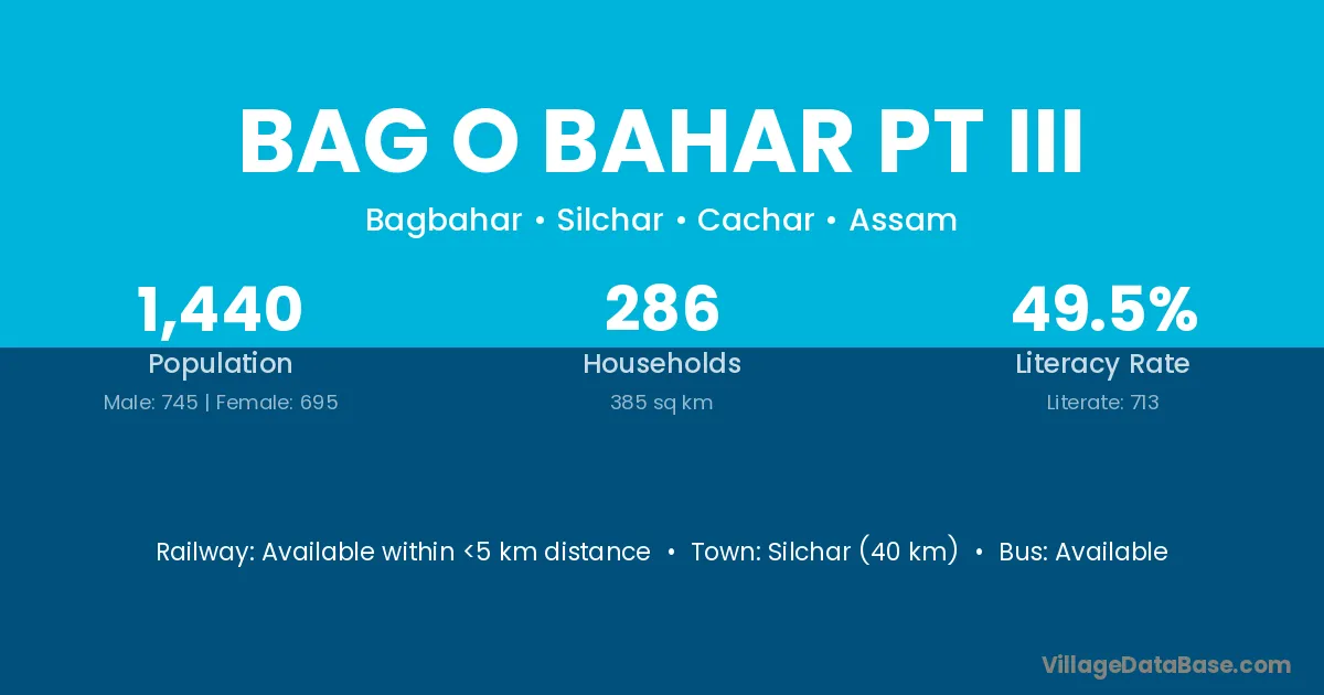Silchar (40 km) is the nearest town to Bag O Bahar Pt Iii village for major economic activities and is located approximately 40 km away.