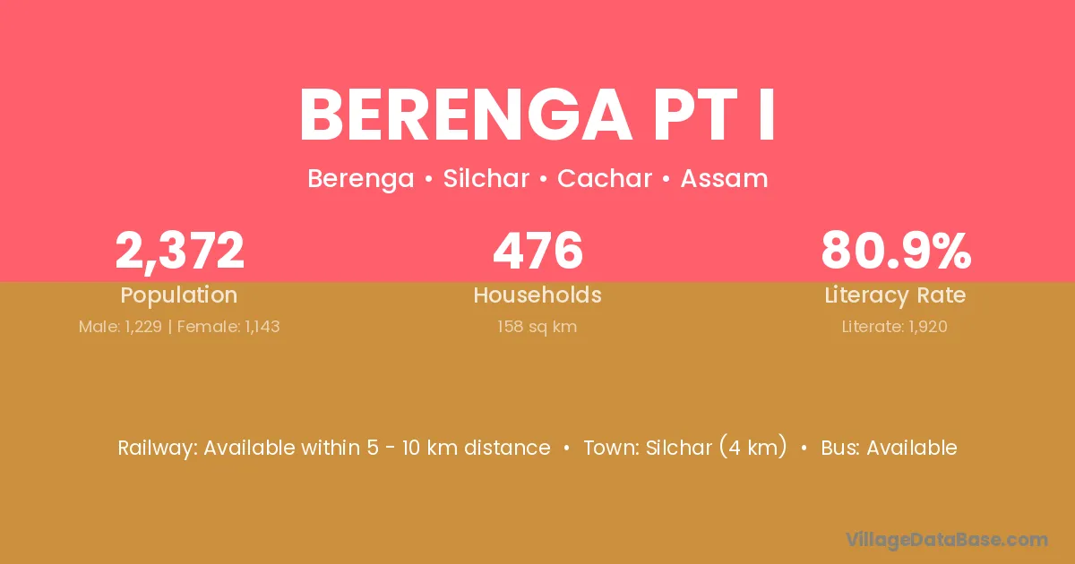 Silchar (4 km) is the nearest town to Berenga Pt I village for major economic activities and is located approximately 4 km away.