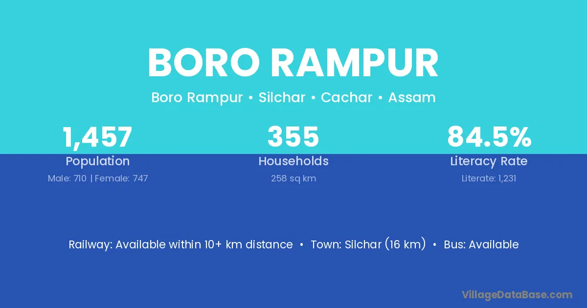 Silchar (16 km) is the nearest town to Boro Rampur village for major economic activities and is located approximately 16 km away.