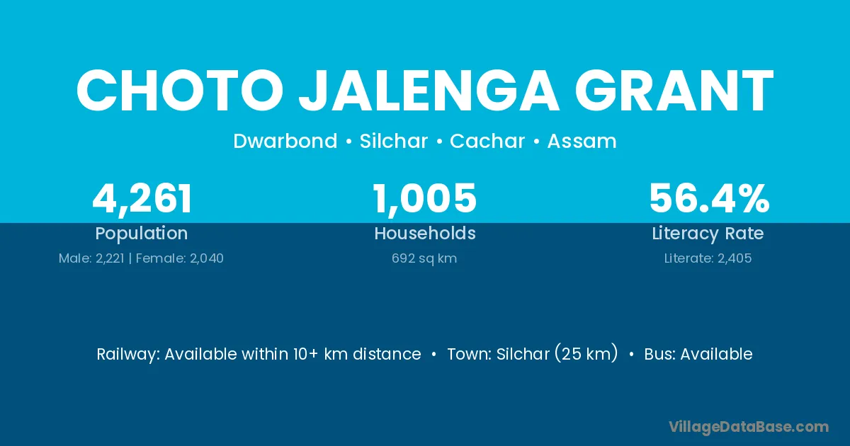 Silchar (25 km) is the nearest town to Choto Jalenga Grant village for major economic activities and is located approximately 25 km away.