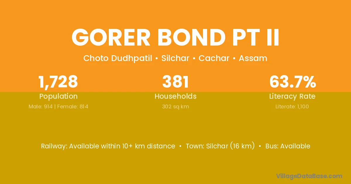 Silchar (16 km) is the nearest town to Gorer Bond Pt Ii village for major economic activities and is located approximately 16 km away.