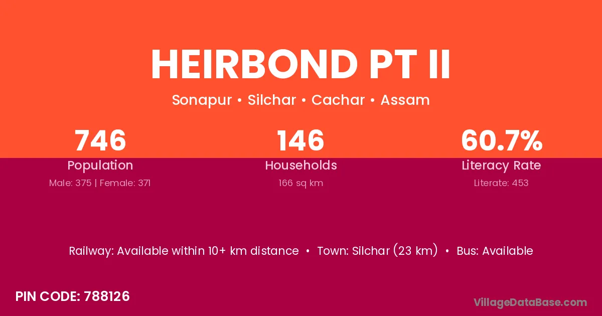 Silchar (23 km) is the nearest town to Heirbond Pt Ii village for major economic activities and is located approximately 23 km away.