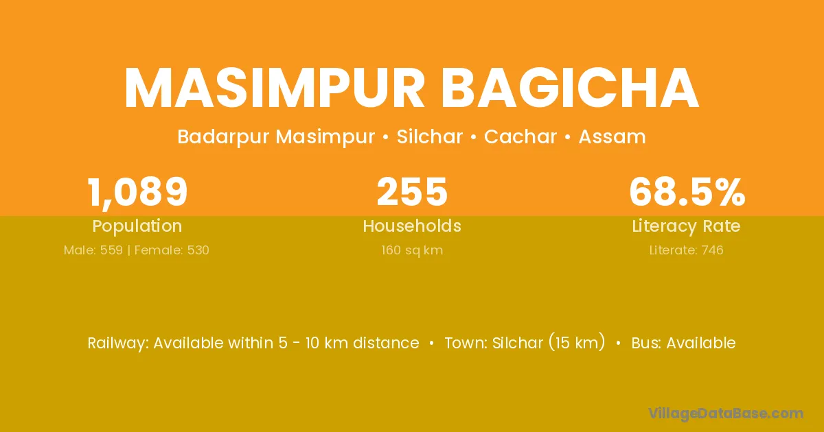 Silchar (15 km) is the nearest town to Masimpur Bagicha village for major economic activities and is located approximately 15 km away.
