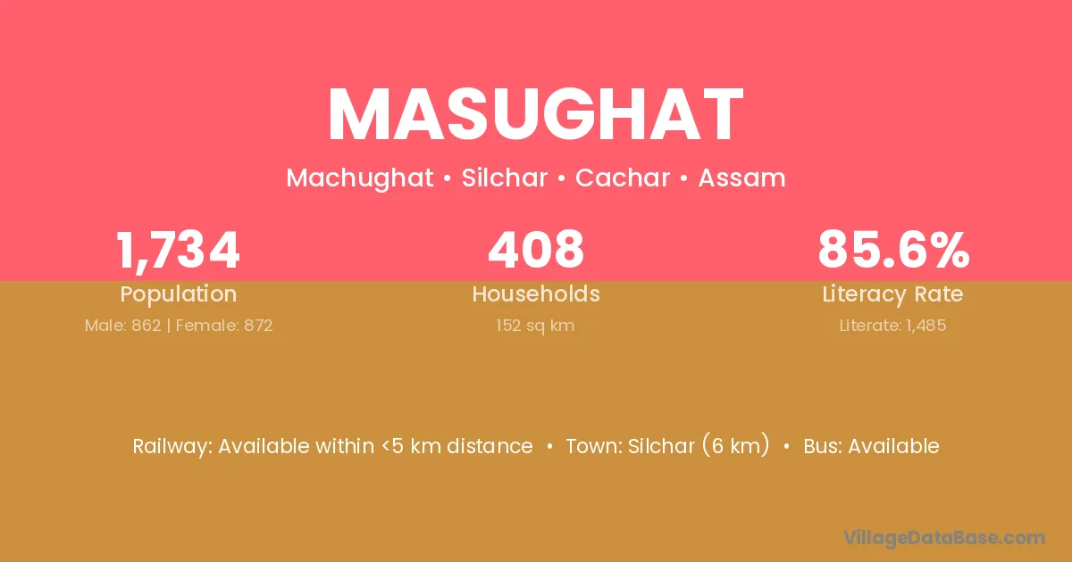 Silchar (6 km) is the nearest town to Masughat village for major economic activities and is located approximately 6 km away.
