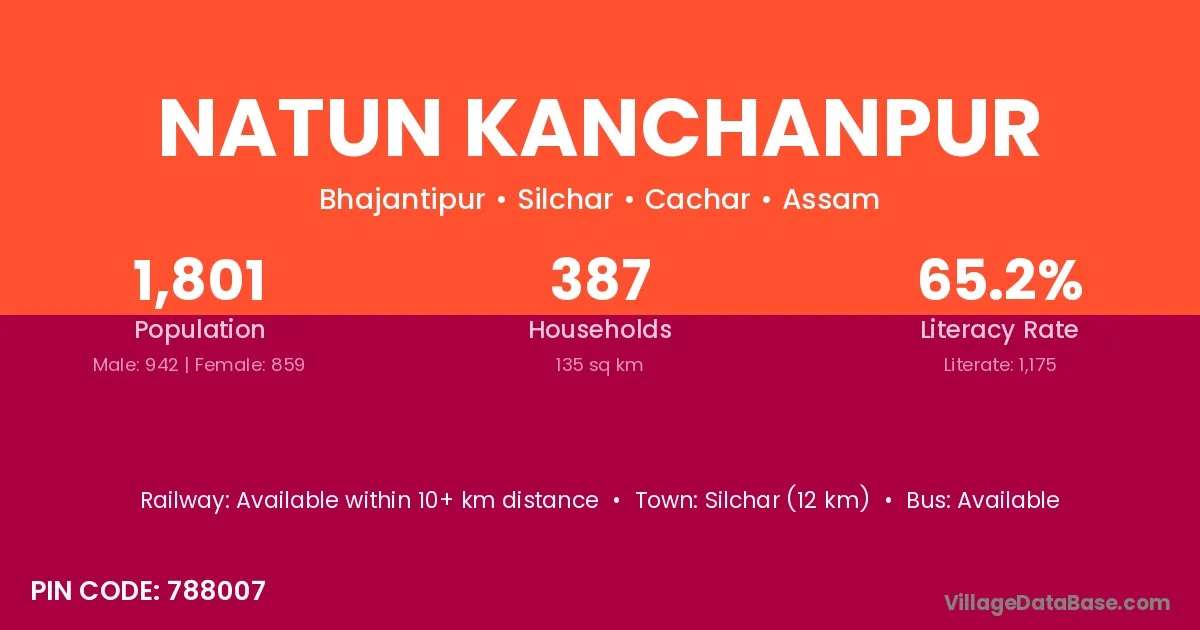 Silchar (12 km) is the nearest town to Natun Kanchanpur village for major economic activities and is located approximately 12 km away.