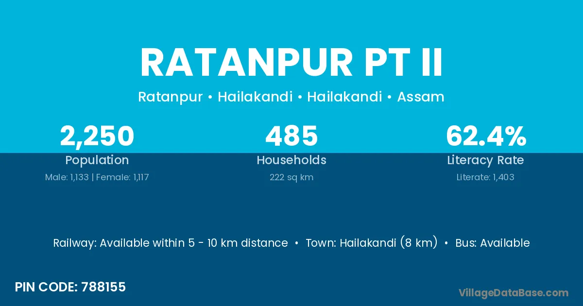 Silchar (35 km) is the nearest town to Ratanpur Pt Ii village for major economic activities and is located approximately 35 km away.