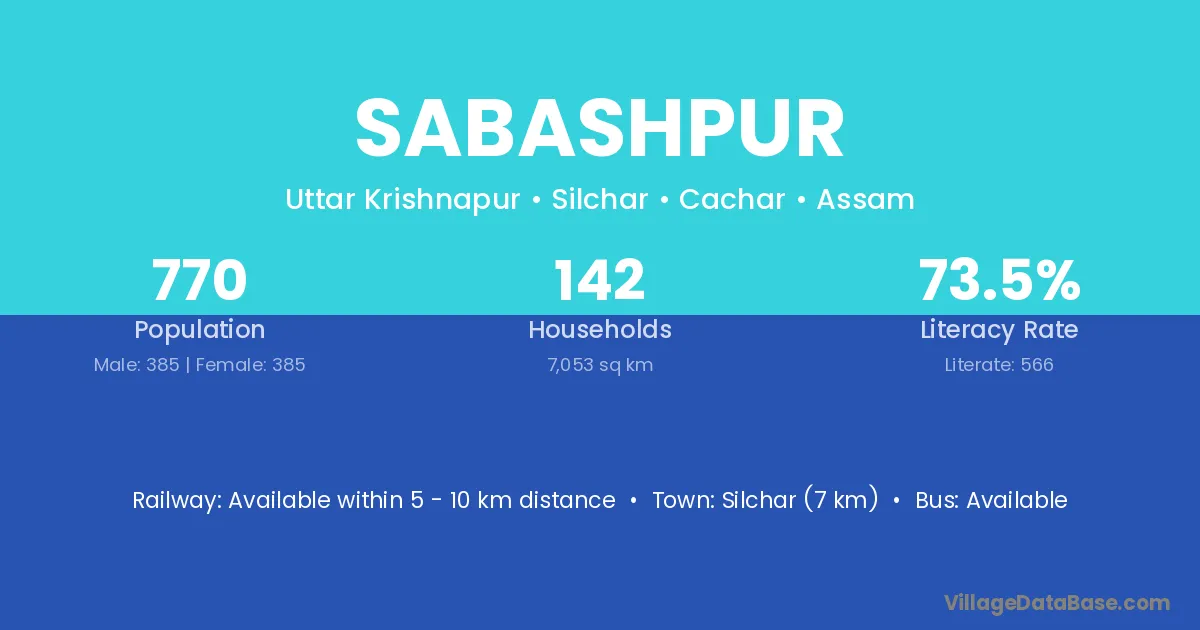 Silchar (7 km) is the nearest town to Sabashpur village for major economic activities and is located approximately 7 km away.