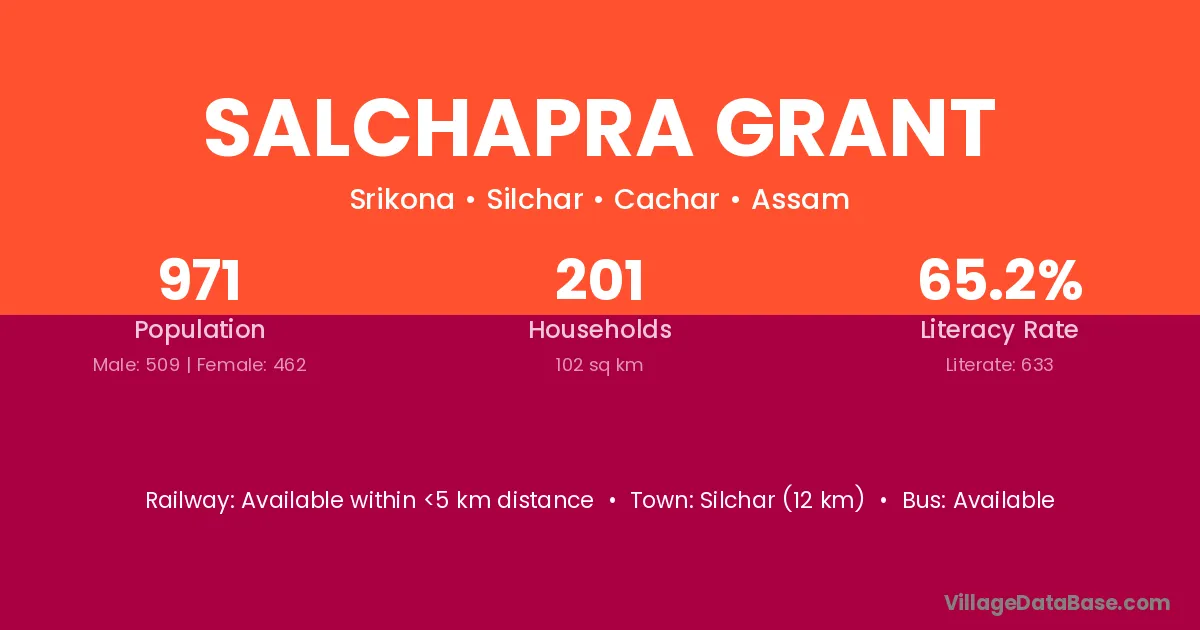 Silchar (12 km) is the nearest town to Salchapra Grant village for major economic activities and is located approximately 12 km away.