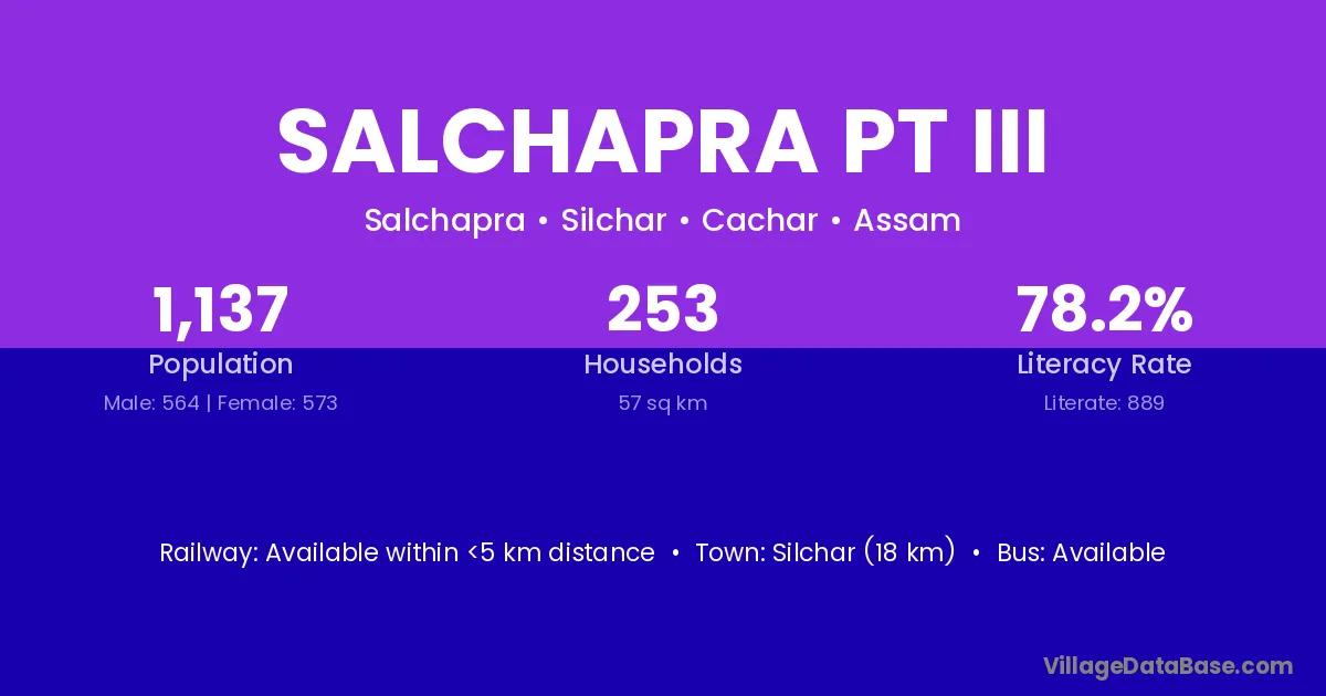Silchar (18 km) is the nearest town to Salchapra Pt Iii village for major economic activities and is located approximately 18 km away.