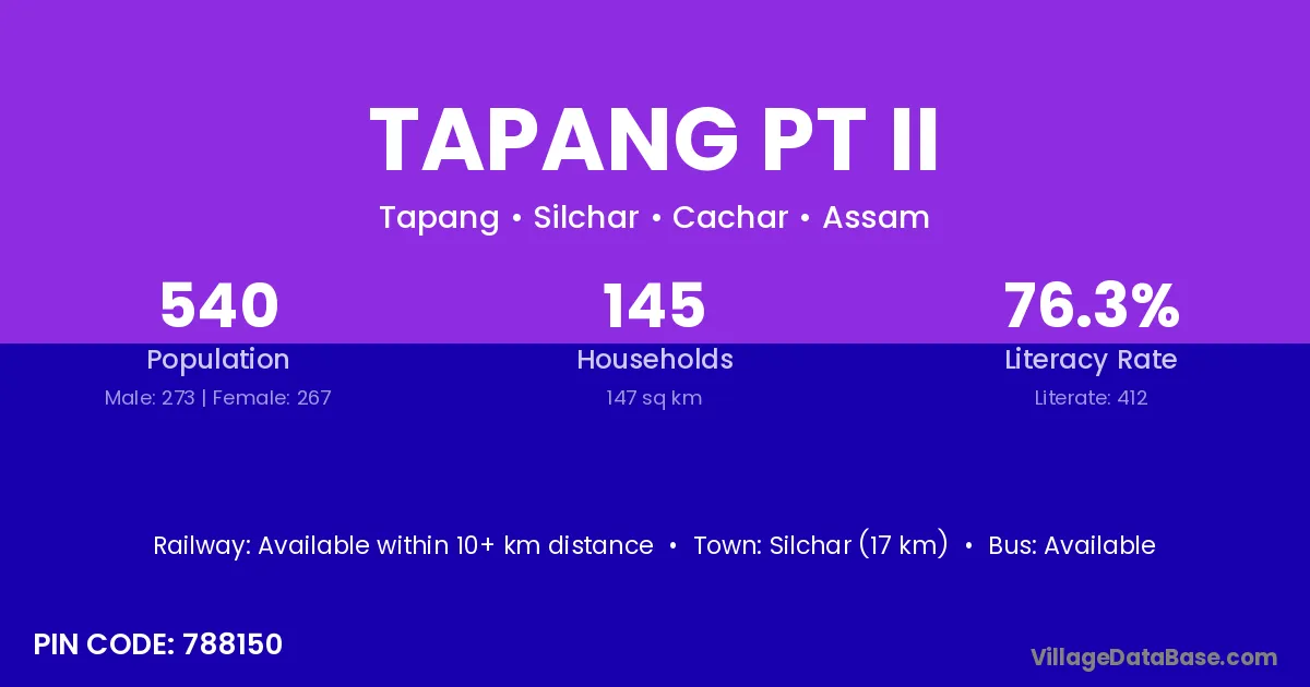 Silchar (17 km) is the nearest town to Tapang Pt Ii village for major economic activities and is located approximately 17 km away.