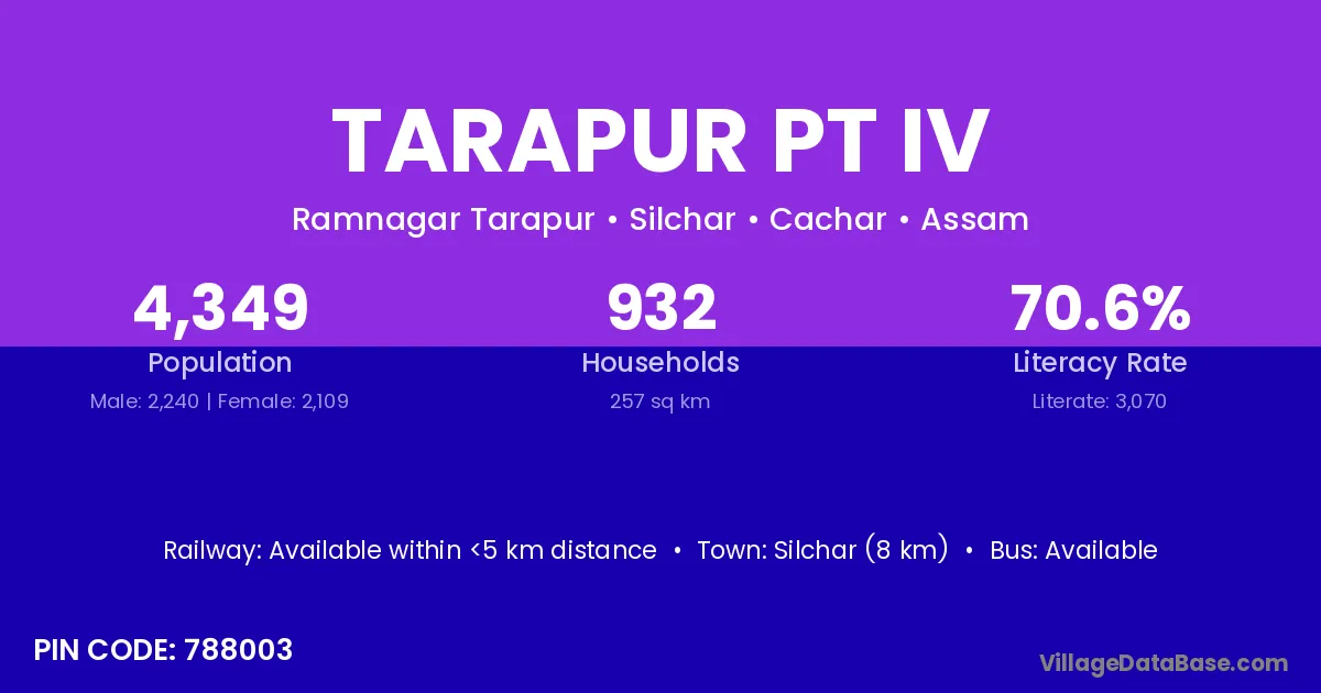 Silchar (8 km) is the nearest town to Tarapur Pt Iv village for major economic activities and is located approximately 8 km away.