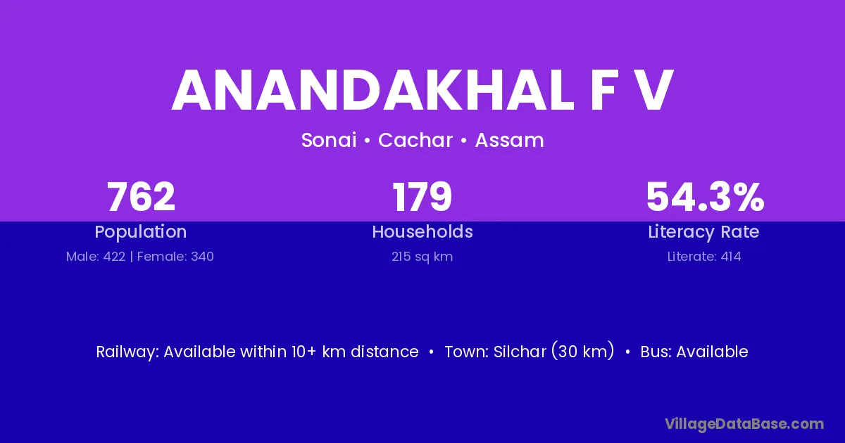 Silchar (30 km) is the nearest town to Anandakhal F V village for major economic activities and is located approximately 30 km away.