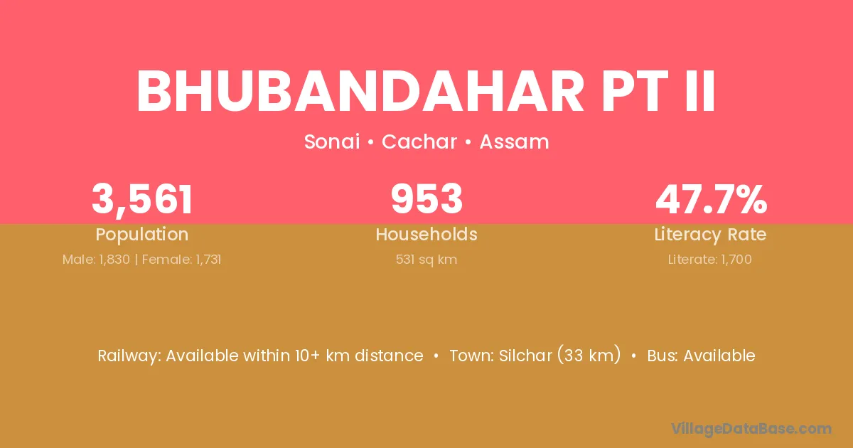 Silchar (33 km) is the nearest town to Bhubandahar Pt Ii village for major economic activities and is located approximately 33 km away.