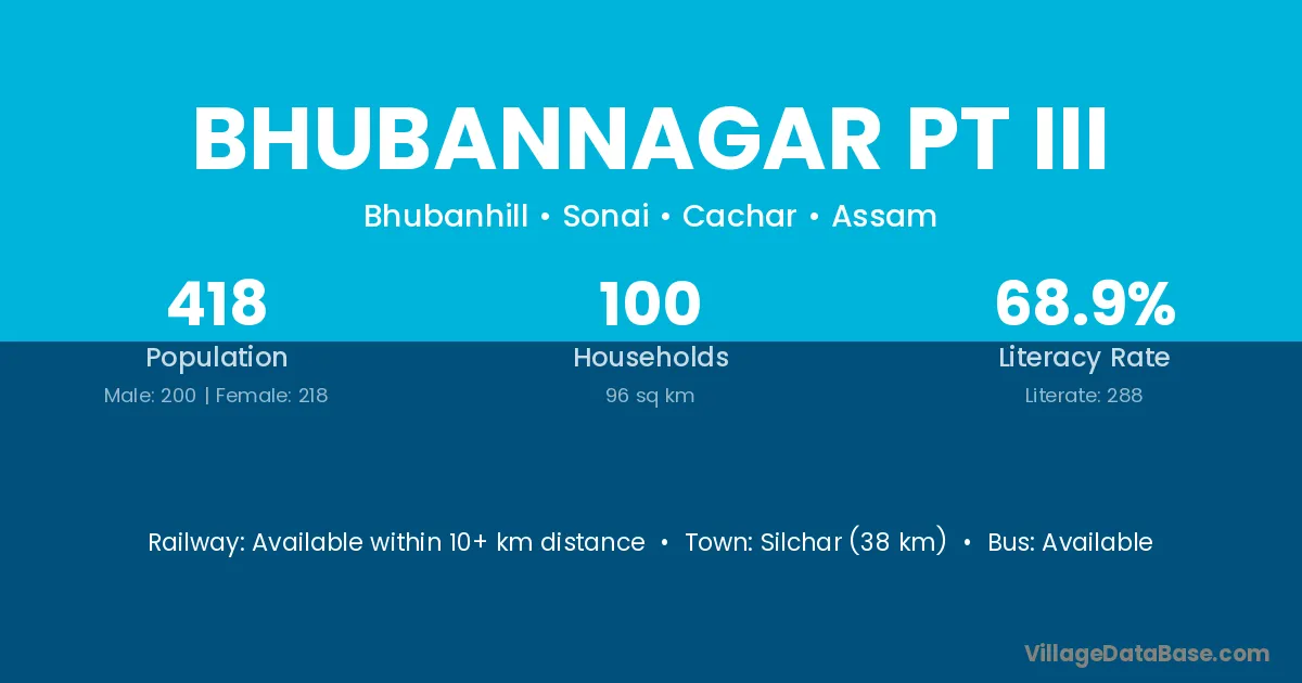 Bhubannagar Pt Iii village has a total population of 418 people, of which 200 are males and 218 are females.