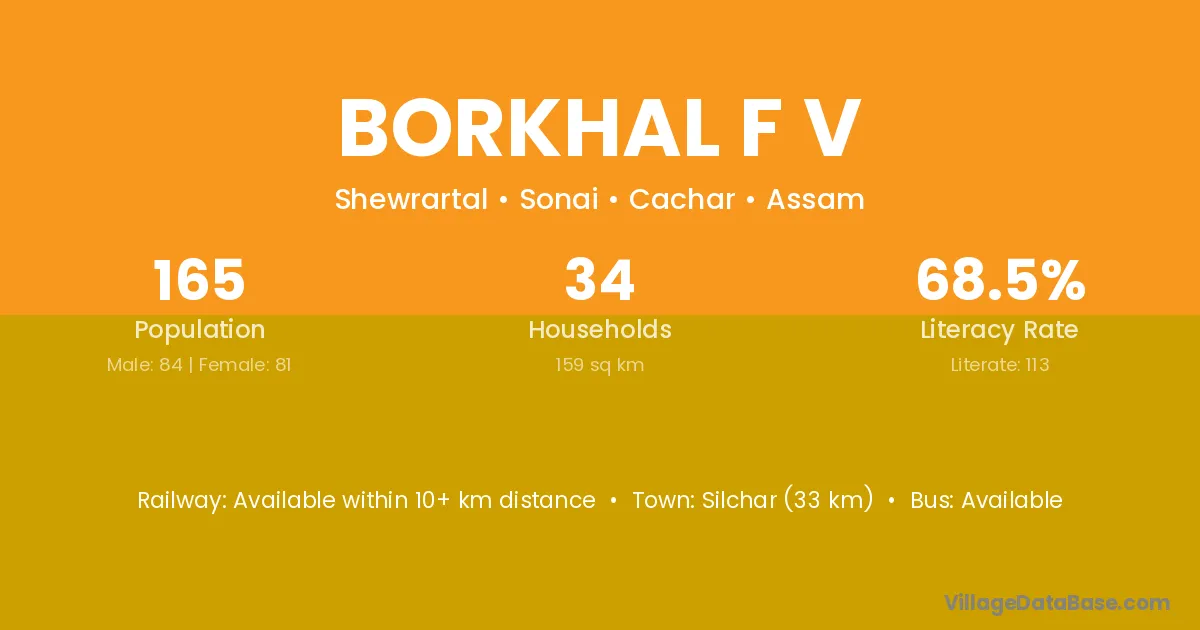 Borkhal F V village has a total population of 165 people, of which 84 are males and 81 are females.