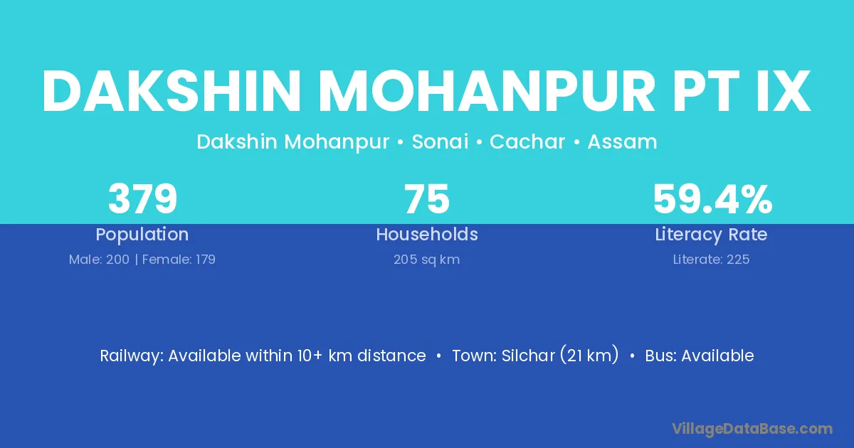 Dakshin Mohanpur Pt Ix village has a total population of 379 people, of which 200 are males and 179 are females.
