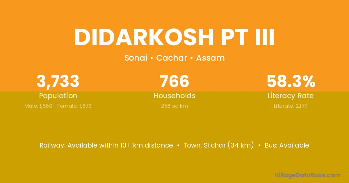Silchar (34 km) is the nearest town to Didarkosh Pt Iii village for major economic activities and is located approximately 34 km away.