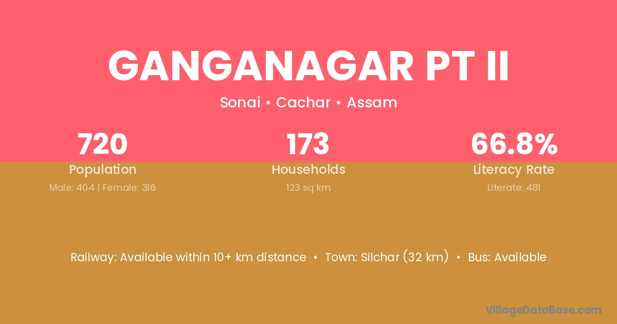 Silchar (32 km) is the nearest town to Ganganagar Pt Ii village for major economic activities and is located approximately 32 km away.
