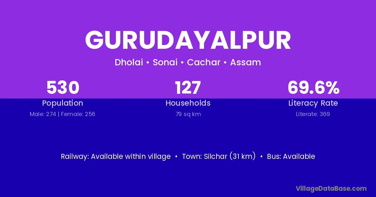 Silchar (31 km) is the nearest town to Gurudayalpur village for major economic activities and is located approximately 31 km away.