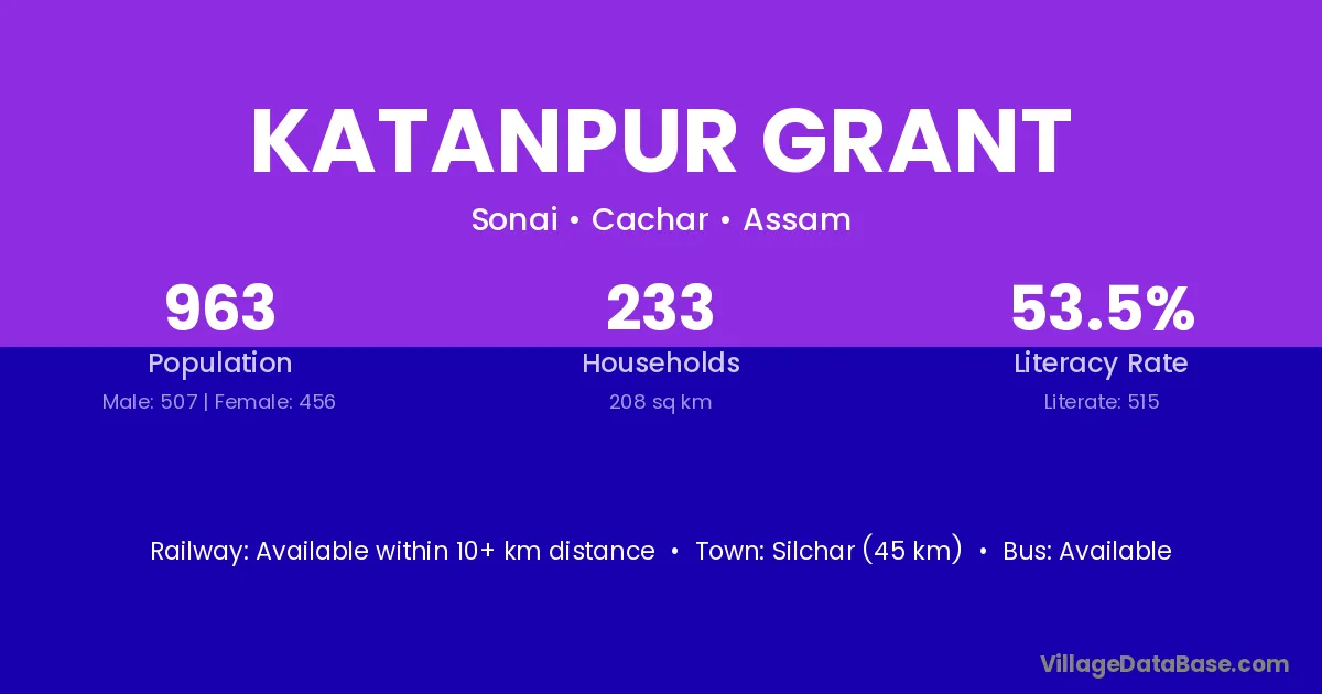 Silchar (45 km) is the nearest town to Katanpur Grant village for major economic activities and is located approximately 45 km away.
