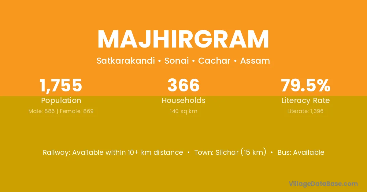 Silchar (15 km) is the nearest town to Majhirgram village for major economic activities and is located approximately 15 km away.
