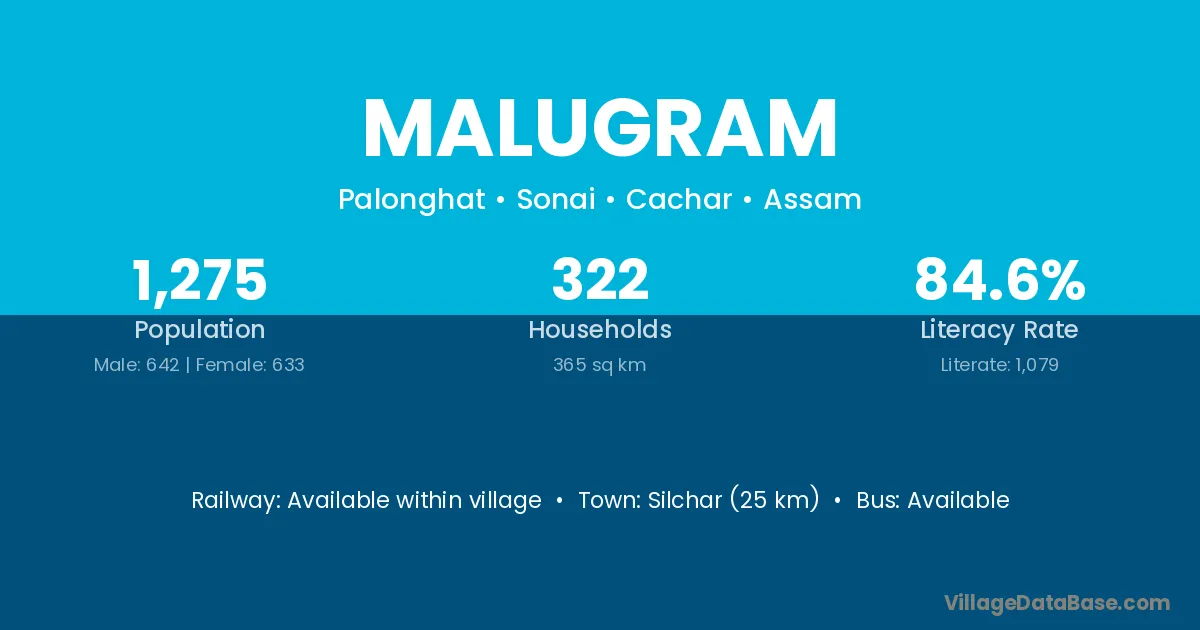 Silchar (25 km) is the nearest town to Malugram village for major economic activities and is located approximately 25 km away.