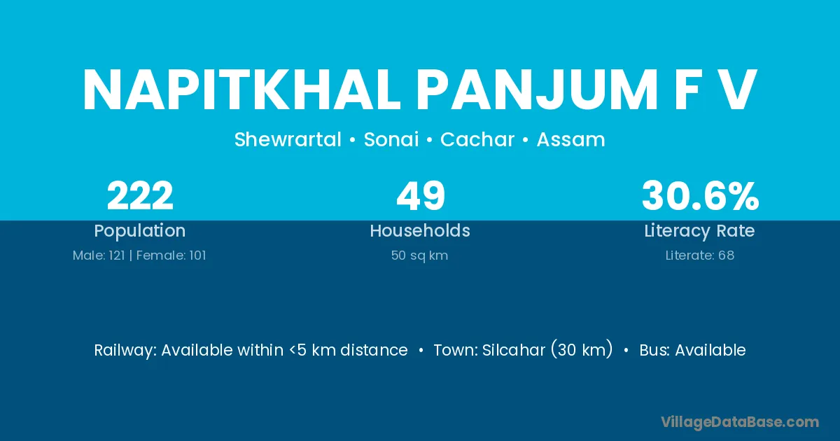Silcahar (30 km) is the nearest town to Napitkhal Panjum F V village for major economic activities and is located approximately 30 km away.