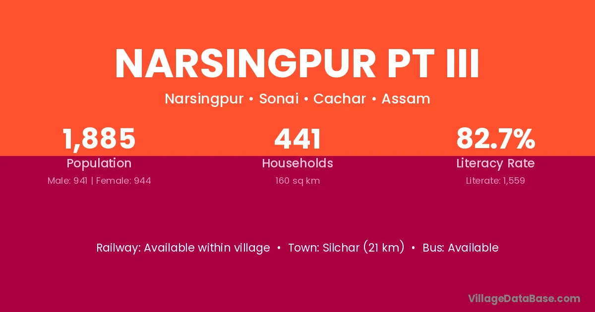 Silchar (21 km) is the nearest town to Narsingpur Pt Iii village for major economic activities and is located approximately 21 km away.