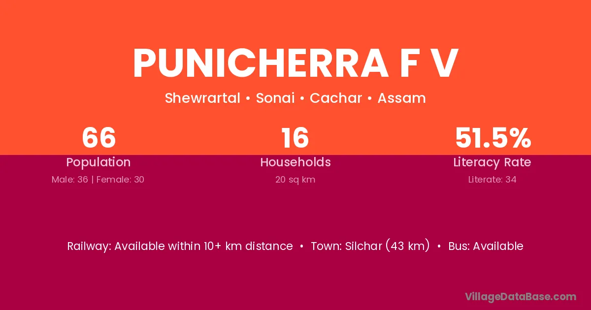 Silchar (43 km) is the nearest town to Punicherra F V village for major economic activities and is located approximately 43 km away.