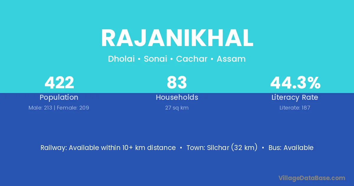 Silchar (32 km) is the nearest town to Rajanikhal village for major economic activities and is located approximately 32 km away.