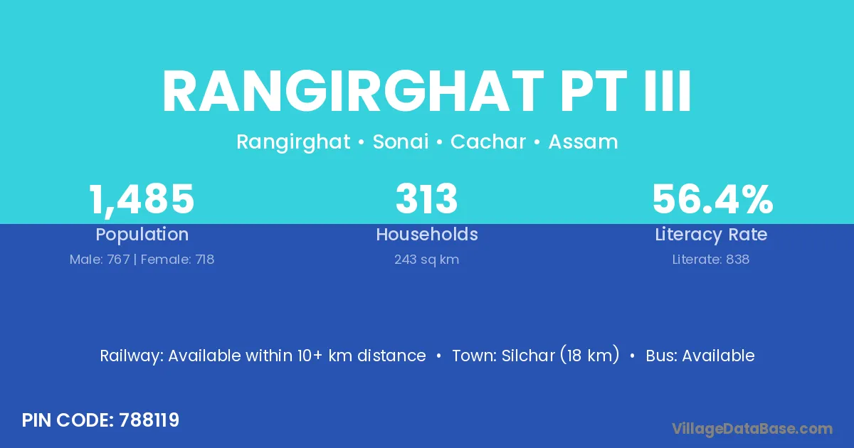 Silchar (18 km) is the nearest town to Rangirghat Pt Iii village for major economic activities and is located approximately 18 km away.