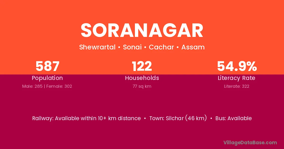 Silchar (46 km) is the nearest town to Soranagar village for major economic activities and is located approximately 46 km away.