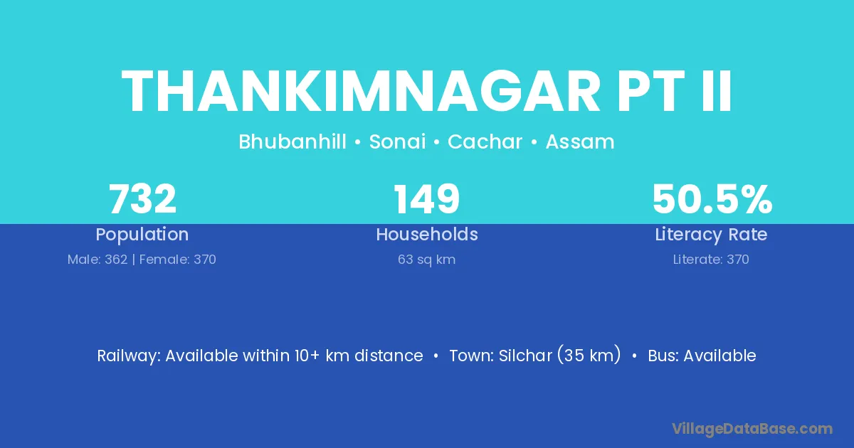 Silchar (35 km) is the nearest town to Thankimnagar Pt Ii village for major economic activities and is located approximately 35 km away.