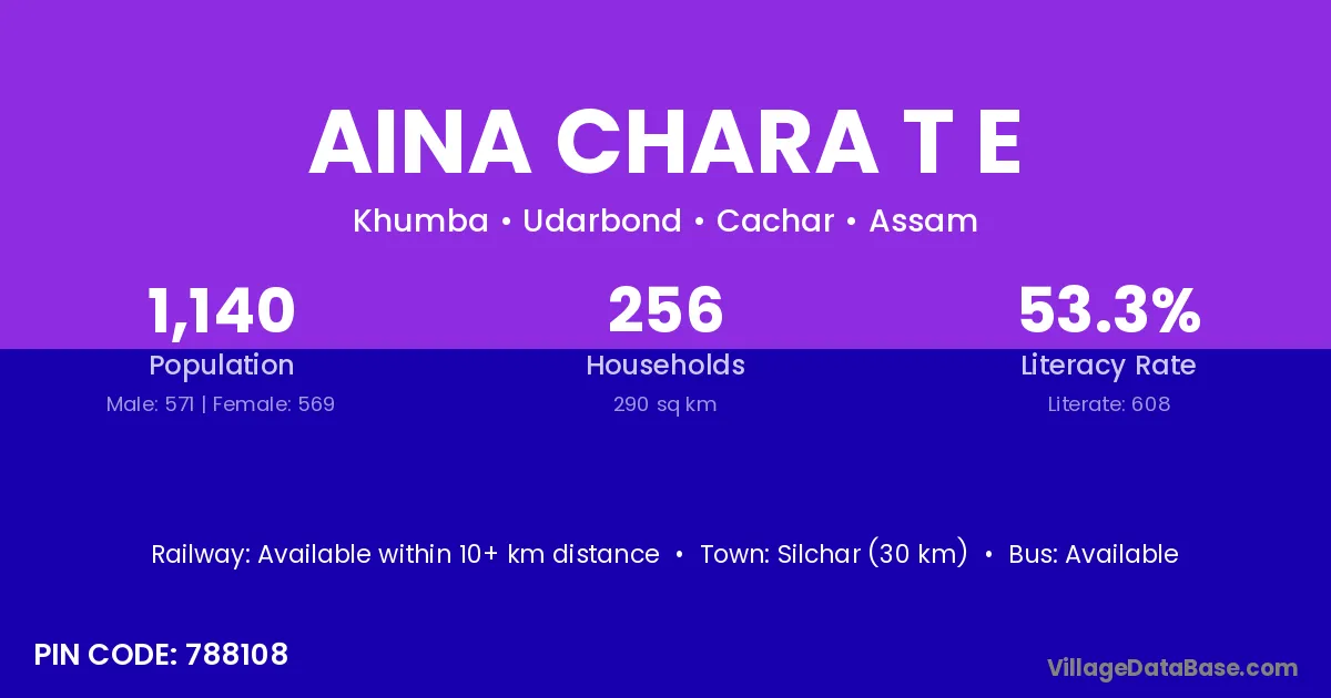 Silchar (30 km) is the nearest town to Aina Chara T E village for major economic activities and is located approximately 30 km away.