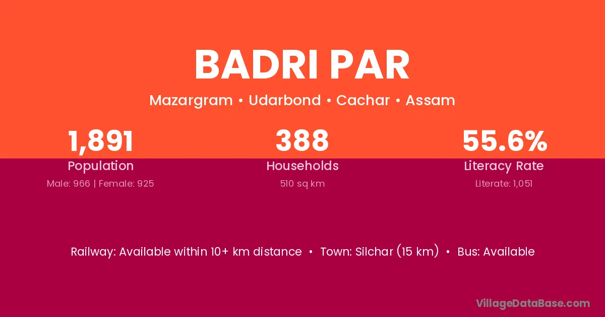Silchar (15 km) is the nearest town to Badri Par village for major economic activities and is located approximately 15 km away.
