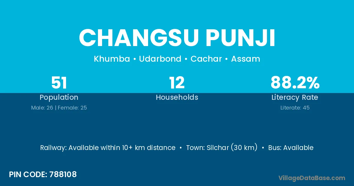 Silchar (30 km) is the nearest town to Changsu Punji village for major economic activities and is located approximately 30 km away.