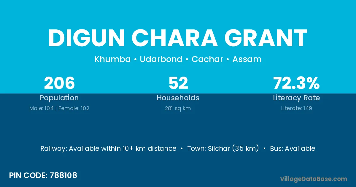 Silchar (35 km) is the nearest town to Digun Chara Grant village for major economic activities and is located approximately 35 km away.