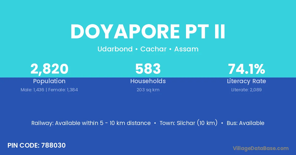 Silchar (10 km) is the nearest town to Doyapore Pt Ii village for major economic activities and is located approximately 10 km away.