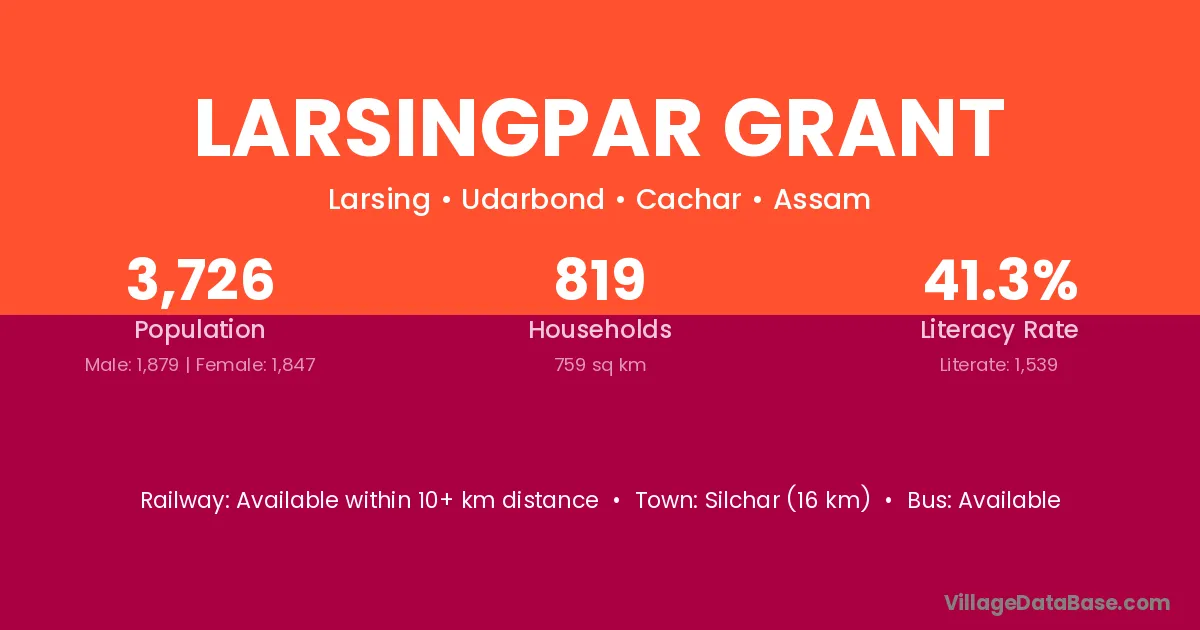 Silchar (16 km) is the nearest town to Larsingpar Grant village for major economic activities and is located approximately 16 km away.