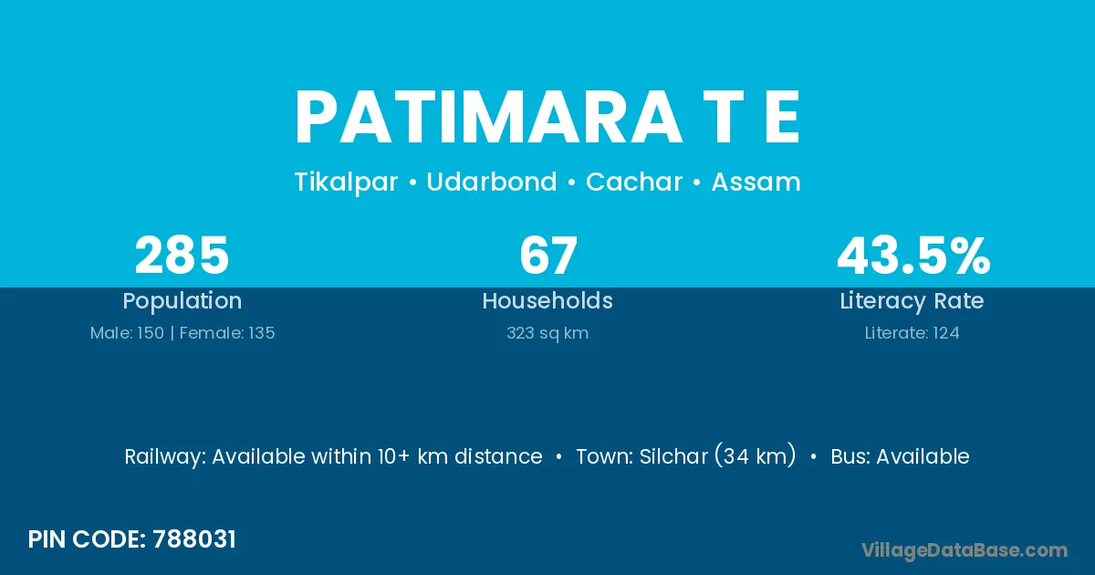 Silchar (34 km) is the nearest town to Patimara T E village for major economic activities and is located approximately 34 km away.