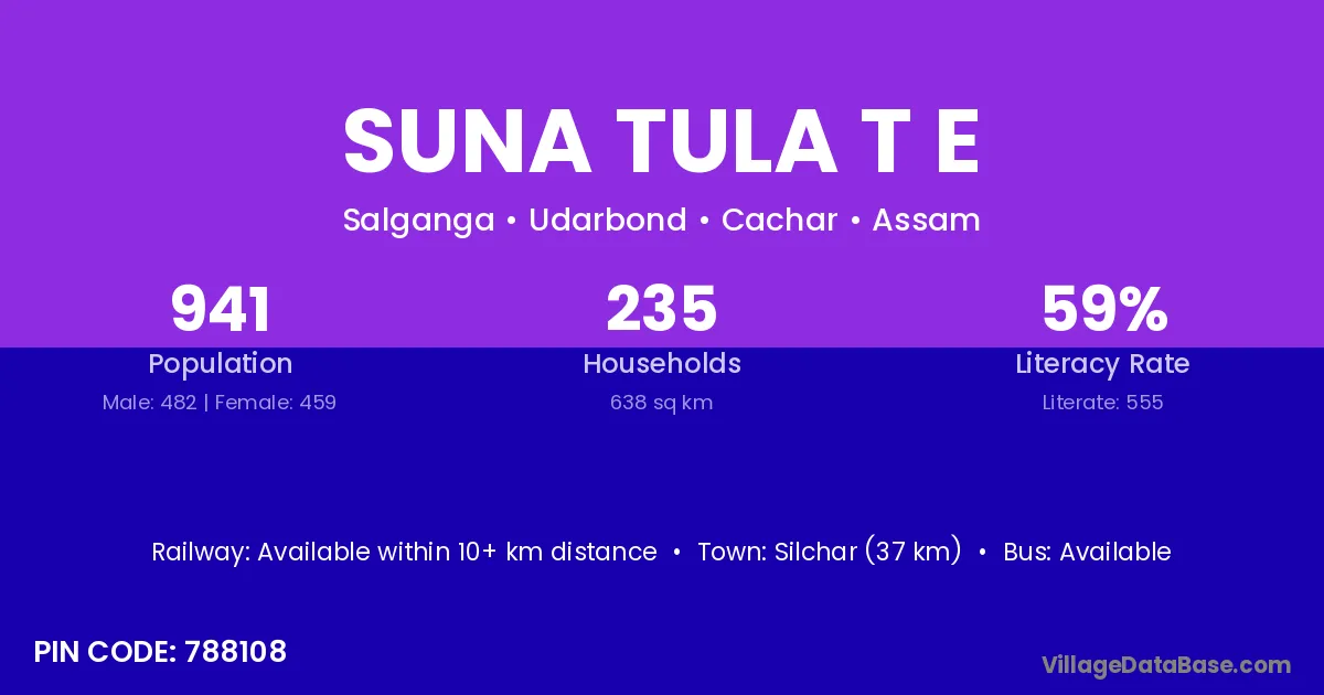 According to Census 2011 information, the village code of Suna Tula T E village is 788108.