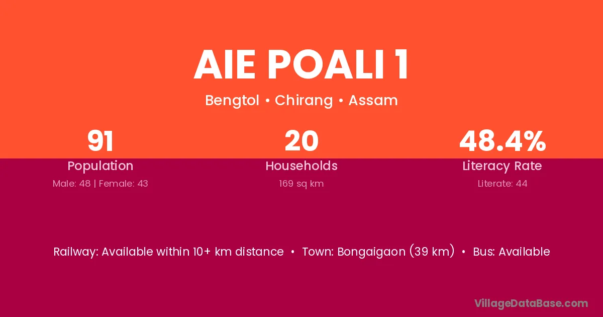 Bongaigaon (39 km) is the nearest town to Aie Poali 1 village for major economic activities and is located approximately 39 km away.
