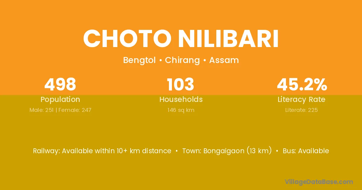 Bongaigaon (13 km) is the nearest town to Choto Nilibari village for major economic activities and is located approximately 13 km away.