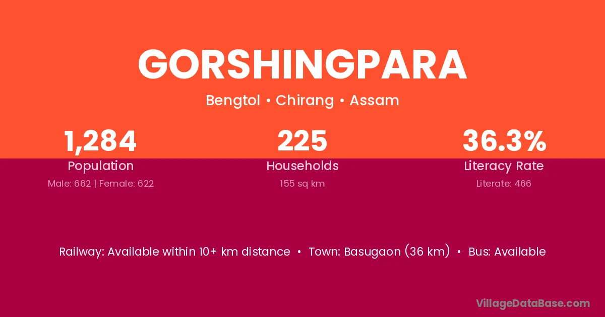 Basugaon (36 km) is the nearest town to Gorshingpara village for major economic activities and is located approximately 36 km away.