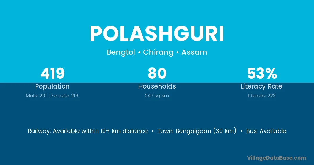 Bongaigaon (30 km) is the nearest town to Polashguri village for major economic activities and is located approximately 30 km away.