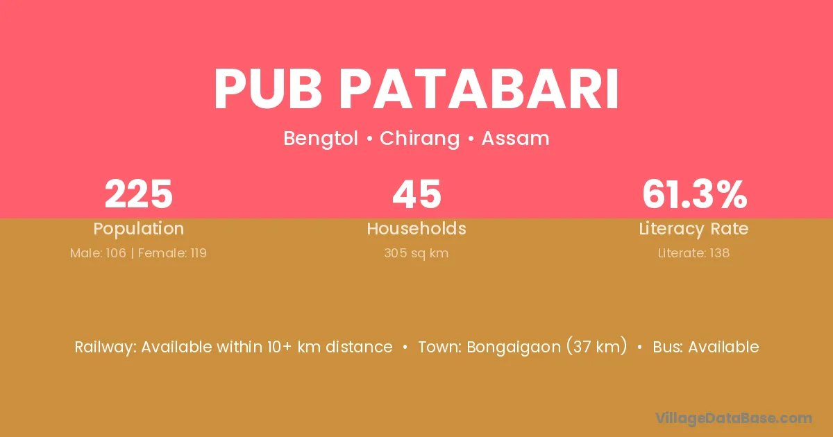 Bongaigaon (37 km) is the nearest town to Pub Patabari village for major economic activities and is located approximately 37 km away.