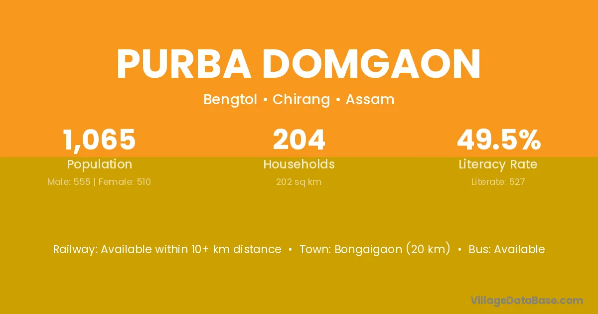 Bongaigaon (20 km) is the nearest town to Purba Domgaon village for major economic activities and is located approximately 20 km away.