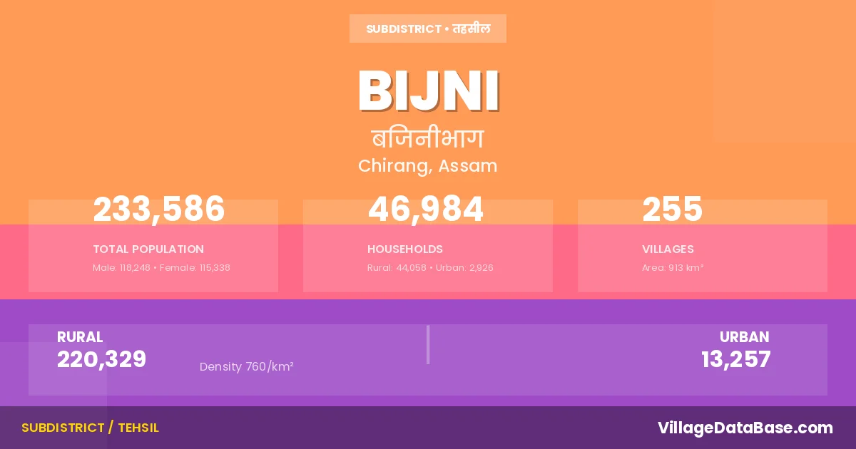 According to the 2011 census The total area of Bijni Subdivision is 913 km², with a population of 233586 people. The population density is 760 inhabitants per square kilometre, and there are approximately 46984 houses in the sub district.