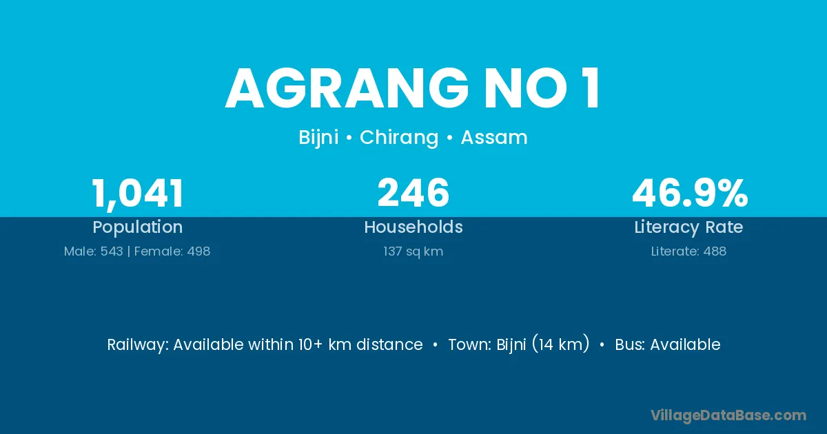 Bijni (14 km) is the nearest town to Agrang No 1 village for major economic activities and is located approximately 14 km away.