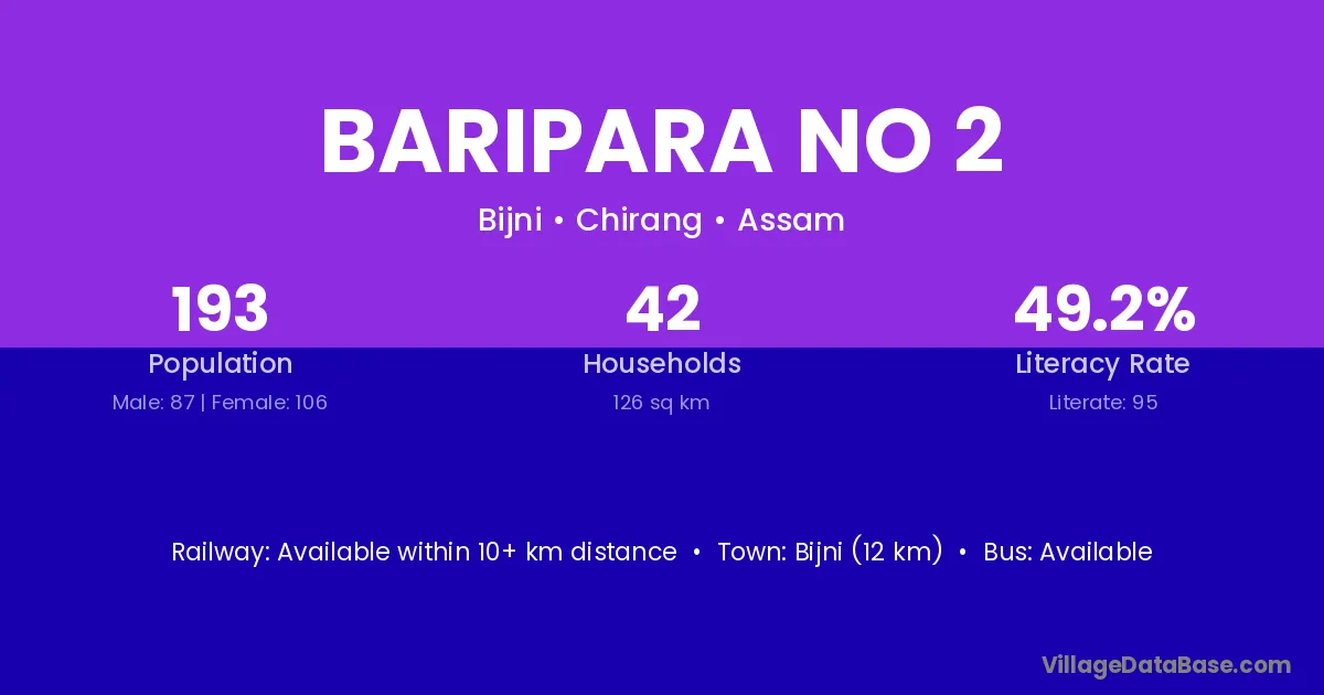 Bijni (12 km) is the nearest town to Baripara No 2 village for major economic activities and is located approximately 12 km away.